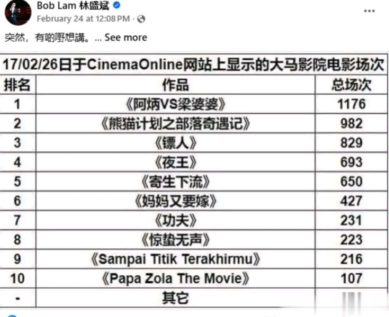 由港星陈山聪、梁烈唯、林盛斌主演的马来西亚贺岁片《妈妈又要嫁!》自上映以来便票房稳步上升,早前突破300万令吉(531万元),主创团队纷纷发文庆贺。林盛斌发文称,《妈妈又要嫁!》并非经典IP或大制作,排片极少,能够取得如此高的票房实属不易,并且晒出了一张马来西亚大年初一电影院排片统计表,显示当天该片仅获得427场,而另一部当地贺岁片、票房冠军《阿炳VS梁婆婆》则高达1176场,引发网友热议。