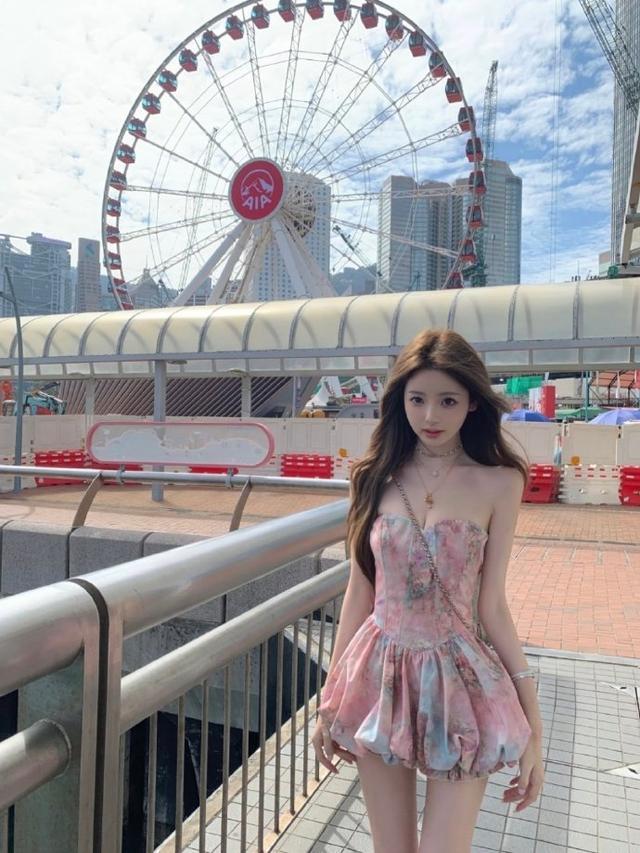 另一套懒懒是穿了一件粉色碎花抹胸花苞裙,这种款式是近年流行的甜美风穿搭。抹胸设计凸显肩颈线条,高腰+短款花苞裙摆,视觉上拉长腿部比例,对小个子非常友好。